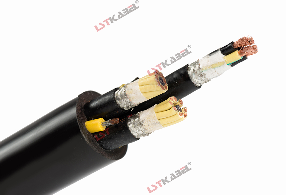 动力 + 控制组合卷筒电缆可同时提供动力电源和控制信号传输,内部包含动力芯线和控制芯线,动力芯线用于传输电能,控制芯线用于传输控制信号,还有加强件钢丝增加电缆抗拉能力,镀锡铜网编制屏蔽层用于抗干扰。